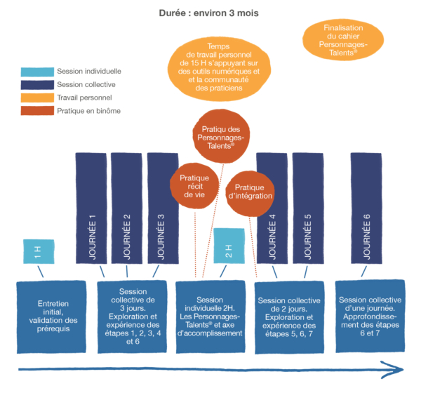 Afin de s’approprier le processus du parcours Personnages-Talents®, la formation combine sur 3 mois : enseignement théorique, expérimentation du parcours et des outils pour soi (notamment la plateforme en ligne du Parcours Personnages-Talents®), dynamique de groupe, séances d’accompagnement individuel, retour d’expérience et feedbacks, temps de travail personnel. Chaque participant pratique, tour à tour, en position de client et de praticien afin d’acquérir rapidement assez d’expérience pour accompagner ses premiers clients dès la fin du premier module.
